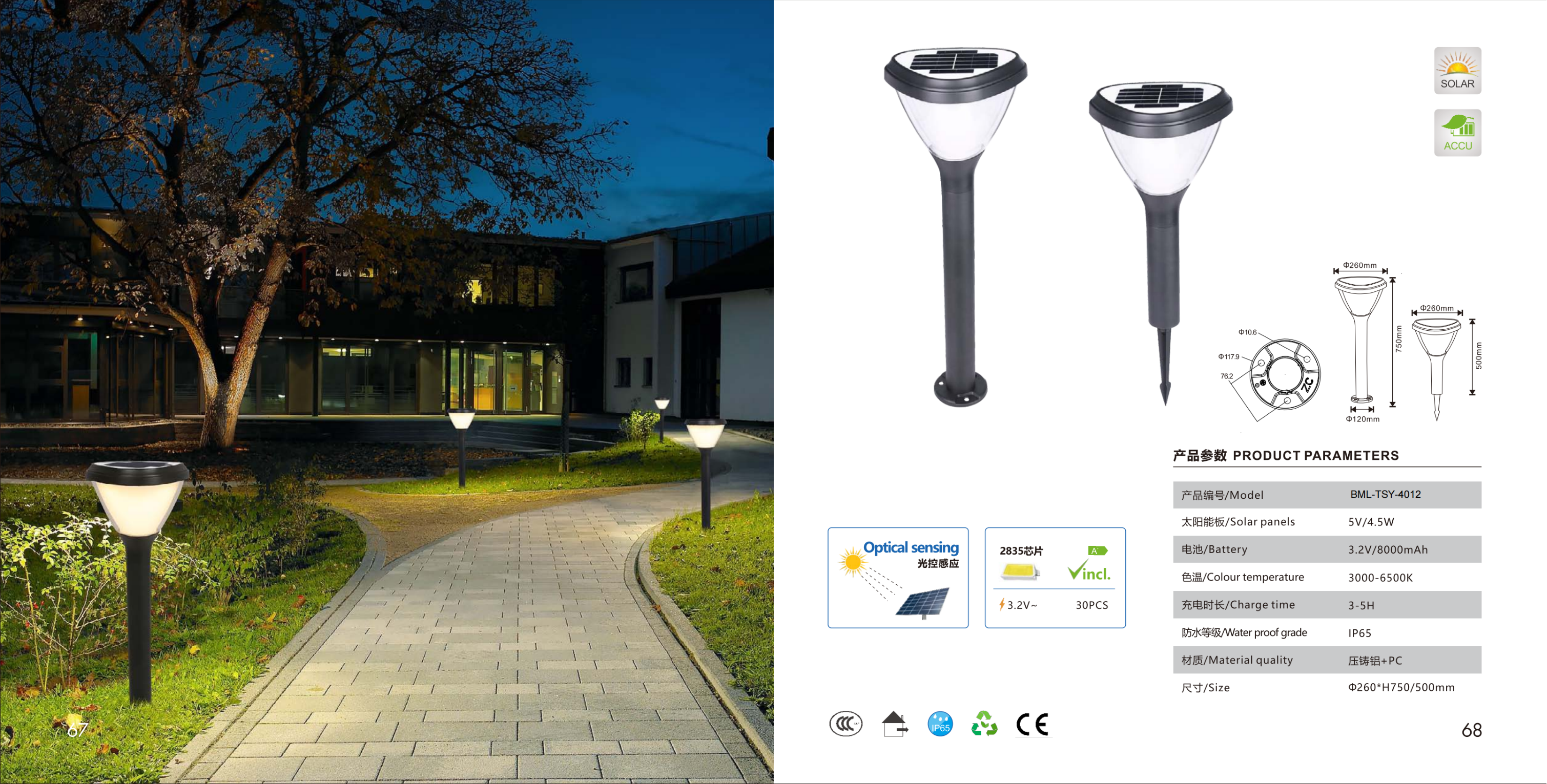 Столбиковый светильник с конусным плафоном на колышке. Солнечная панель встроена, оптический датчик. 30 светодиодов 2835.