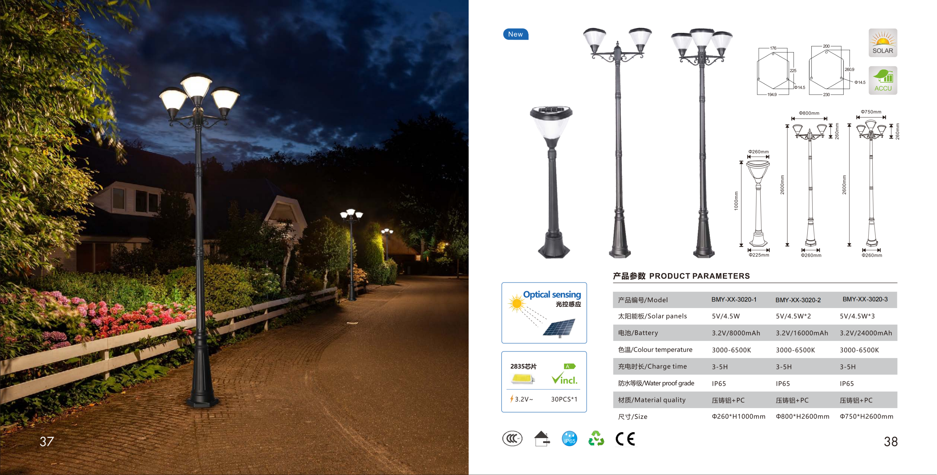 Европейский садовый фонарь с 1, 2 или 3 головами на декоративном столбе. Солнечная панель встроена.