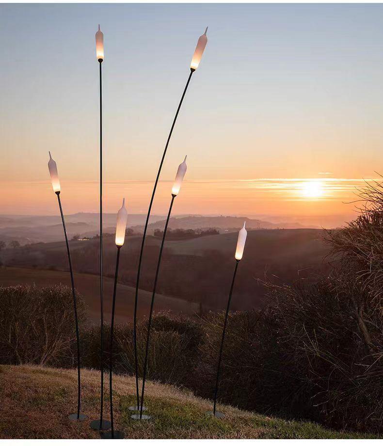 Тонкие ландшафтные светильники в виде свечей или ростков. Алюминий + акрил. 3 или 6 штук в наборе.