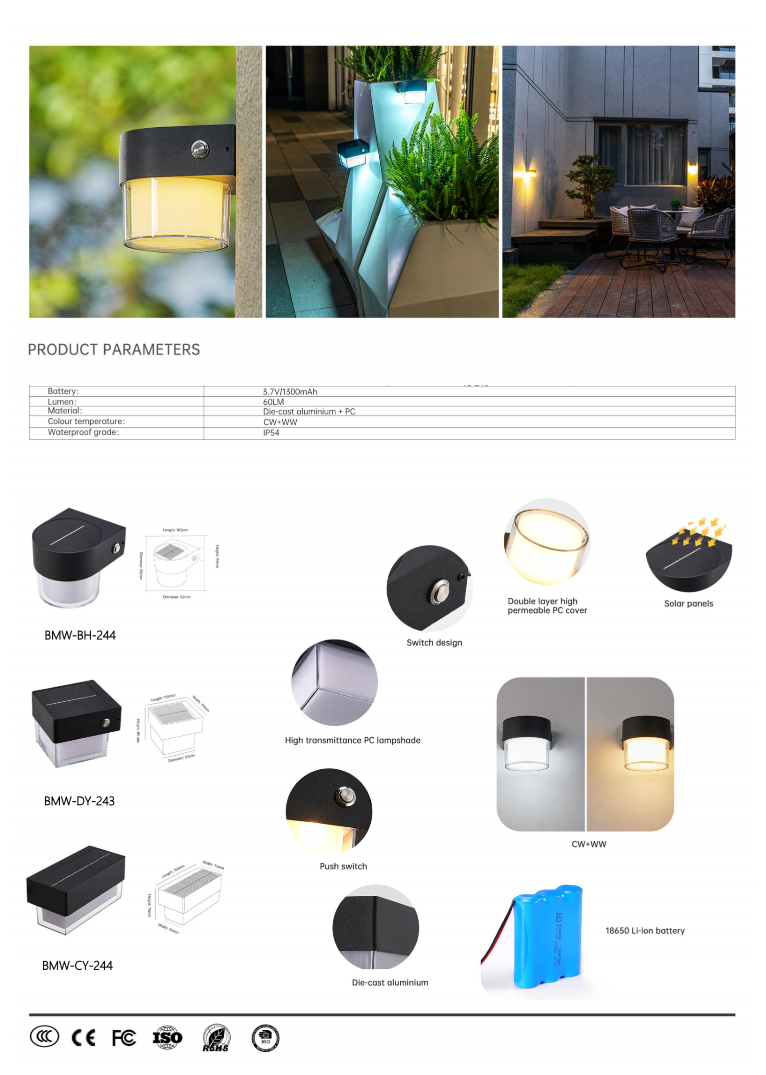 Настенные солнечные светильники с двухслойным PC-плафоном высокой прозрачности. Литой алюминий, кнопочный выключатель. Батарея 18650 Li-ion.