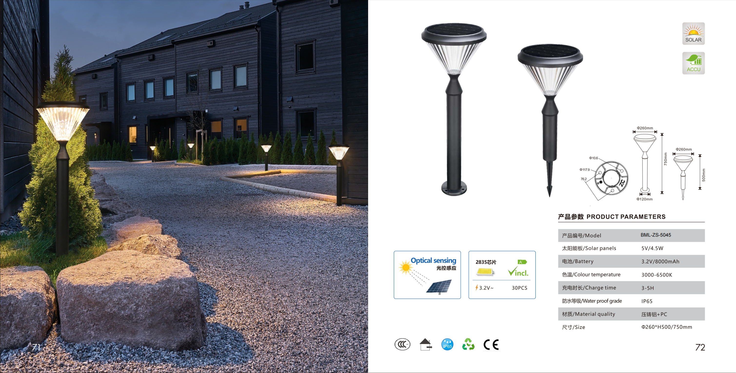 Столбиковый светильник с воронкообразным плафоном на колышке. Солнечная панель встроена, оптический датчик. 30 светодиодов 2835.