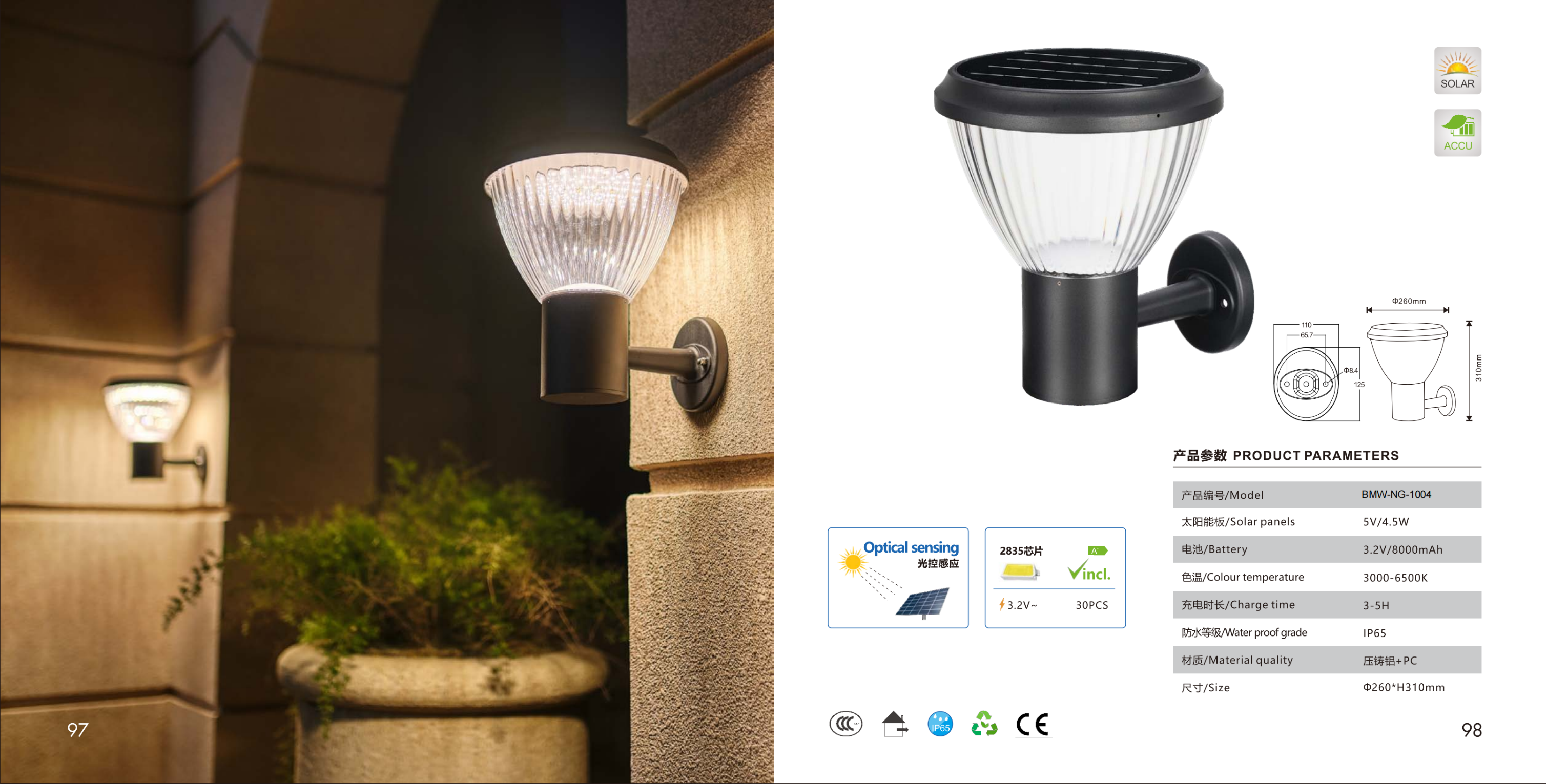 Столбовой светильник с чашеобразным плафоном. Солнечная панель встроена, оптический датчик. 30 светодиодов 2835.