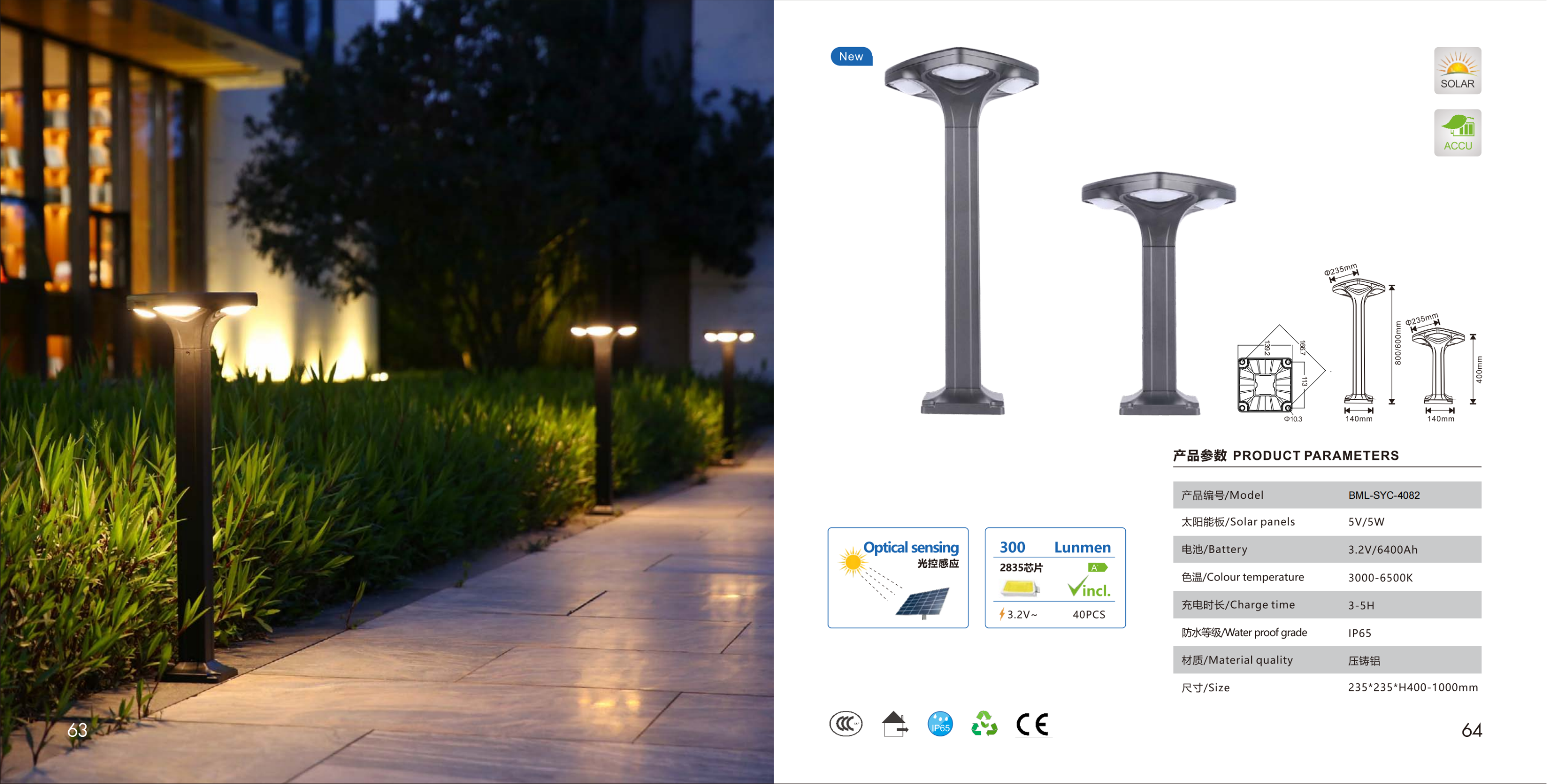 Т-образный столбиковый светильник с плоским плафоном. Солнечная панель встроена, оптический датчик. 300 люмен, 40 светодиодов 2835.
