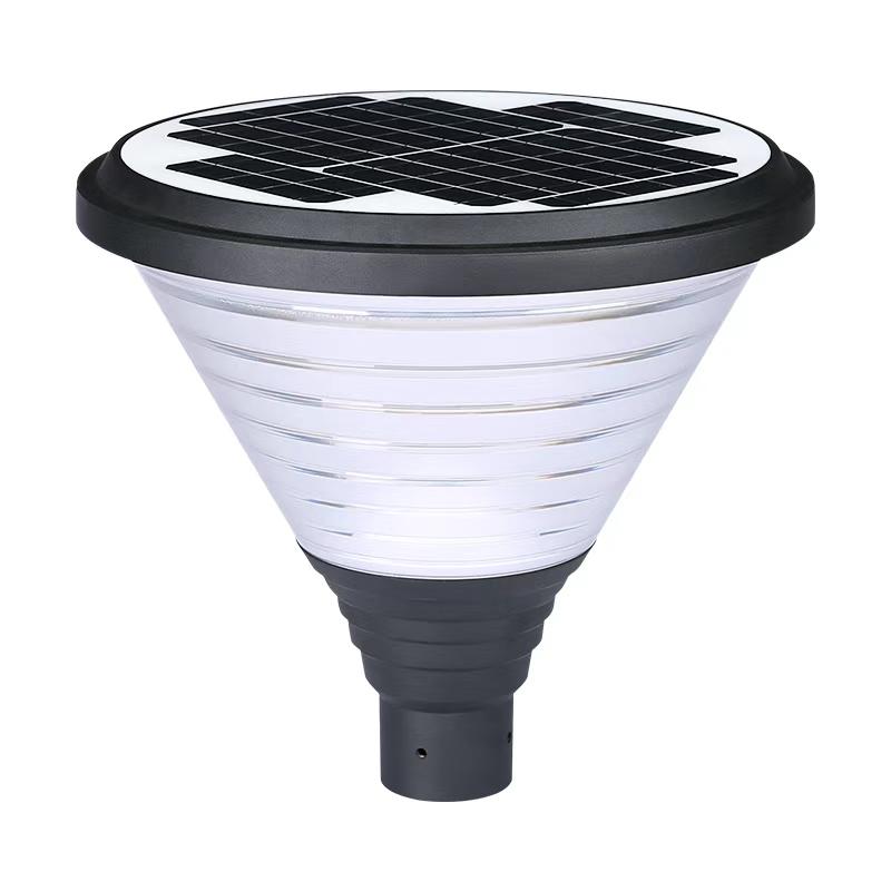 Фонарь с конусным полосатым плафоном и солнечной панелью на вершине. Компактный и стильный.