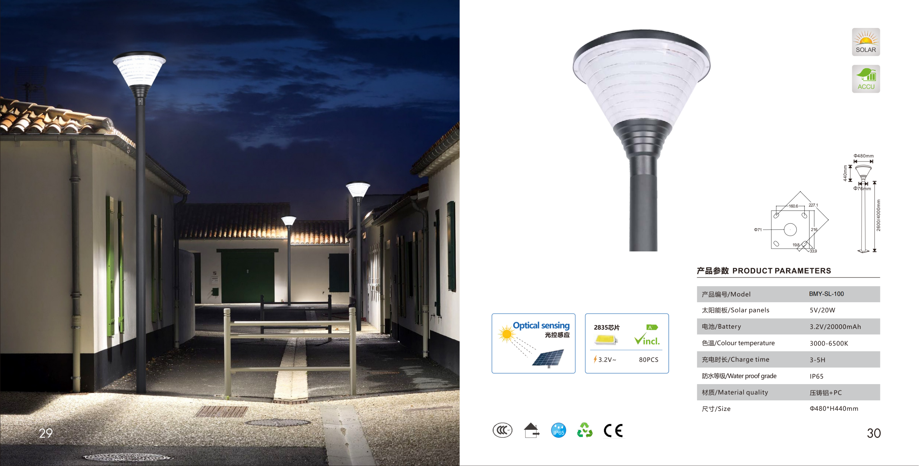 Фонарь с коническим плафоном из полупрозрачного PC. Солнечная панель встроена, оптический датчик. 80 светодиодов 2835.