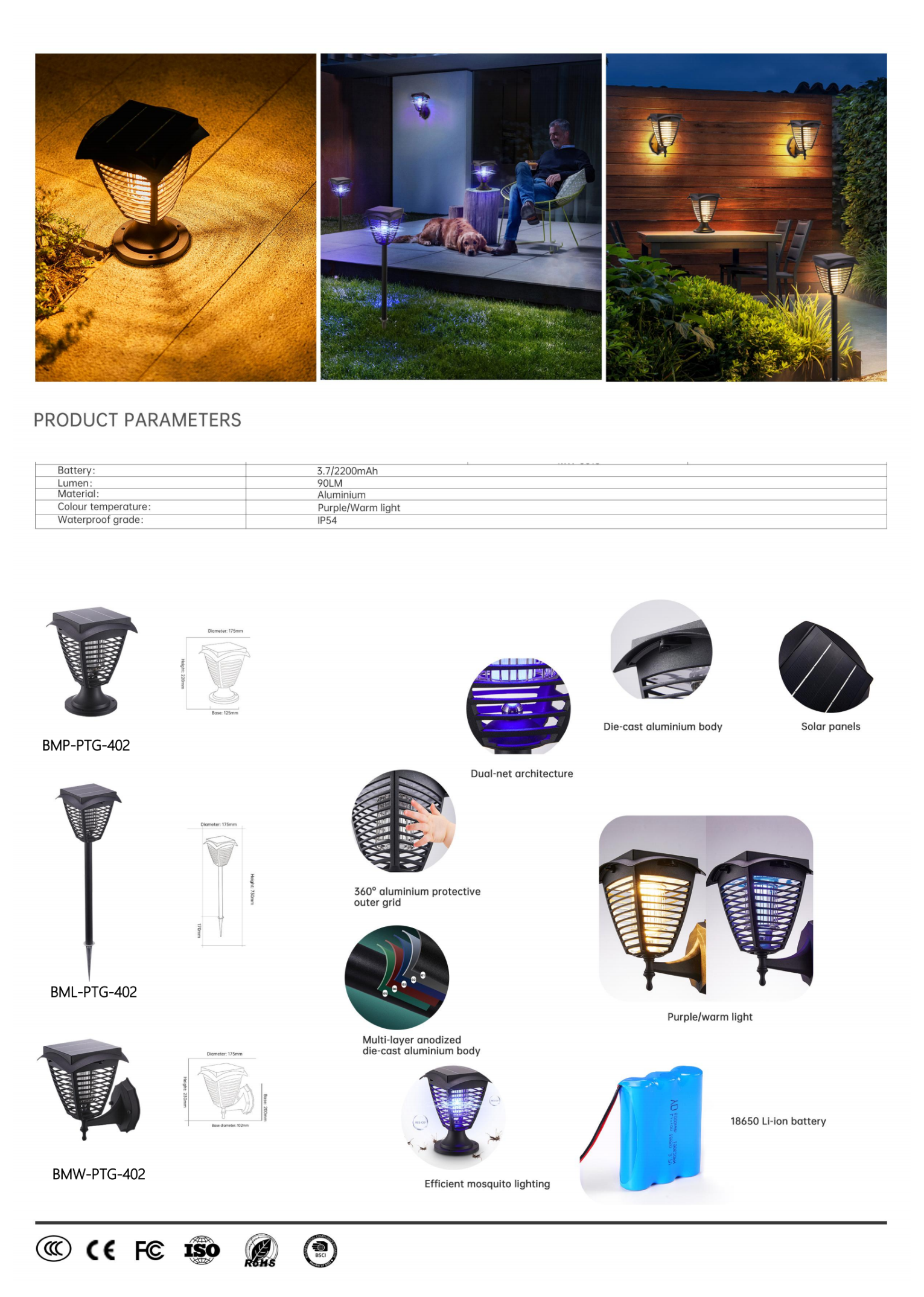 Солнечный антимоскитный светильник с двойной сеткой. Алюминиевый корпус с защитной решёткой 360°. Фиолетовый/тёплый свет. 90 люмен. Три варианта установки.